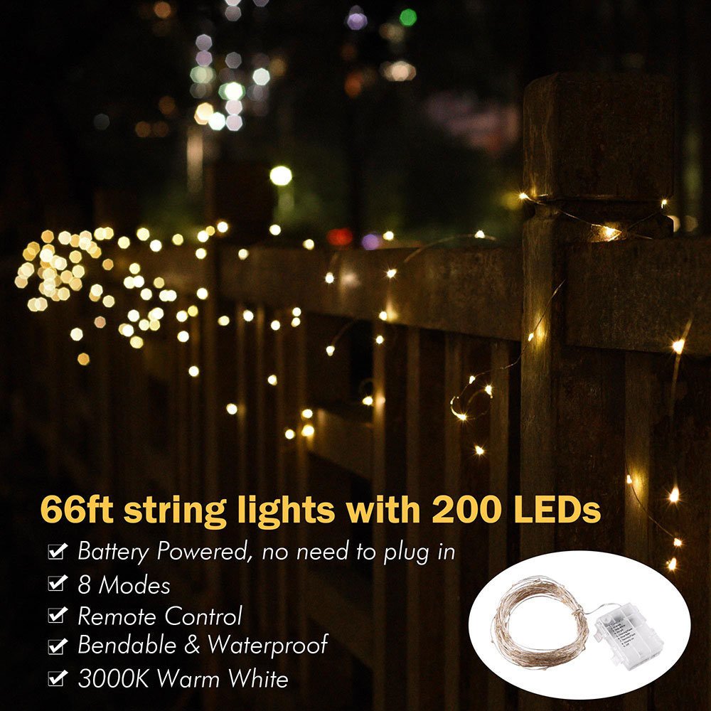 - Festival Decoration - DELight 66ft Fairy Light String with 200pcs LED beads features battery-powered design without the need to plug in; and a remote controller for setting and adjusting time; brightness and modes; allowing for convenient usage as both an indoor or outdoor decorative feature