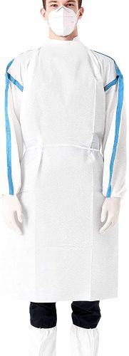 • Disposable isolation gown covers the torso; fits comfortably over the body; protects skin and have long sleeves. Our disposible gown is a convenient option for food service professionals who work with raw meat and fish; chop up delicacies or clean with dish soap; in manufacturing; farming; painting; gardening; home cleaning; cooking. These disposable gowns with sleeves offer simple and effective protection.