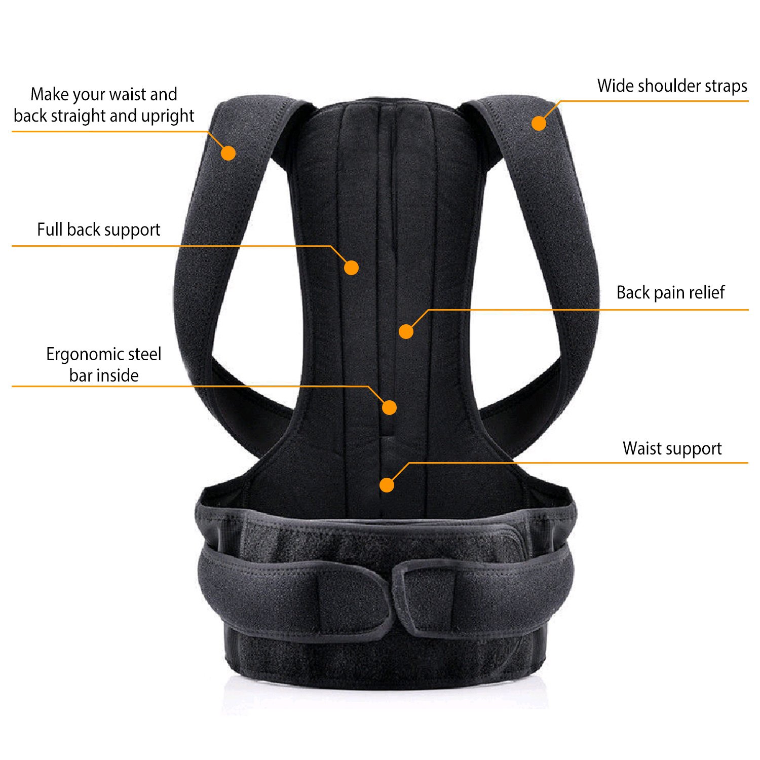 **EASY TO WEAR*:You can wear our back posture corrector in a few minutes. Firstly,cross the two shoulder straps through the fixed point. Secondly,put on the back posture corrector and fasten the waist band. Thirdly,Adjust the shoulder straps and pull them to attach the fasten tape on the waist belt.