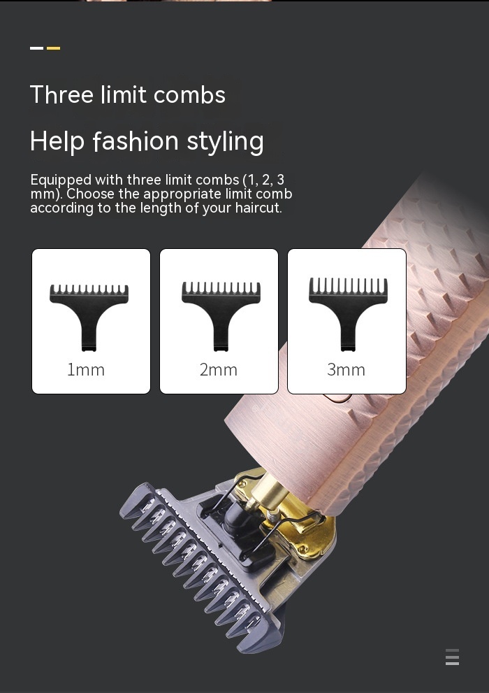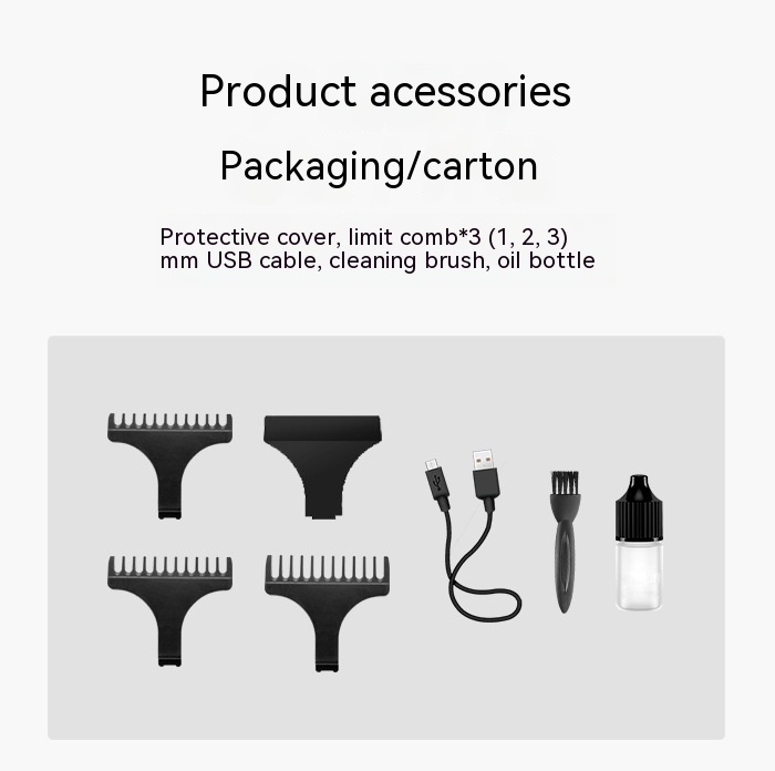 Product accessories: protective cover, limit comb * 3 (1,2,3) mm, USB cable, cleaning brush, oil bottle Product Image: