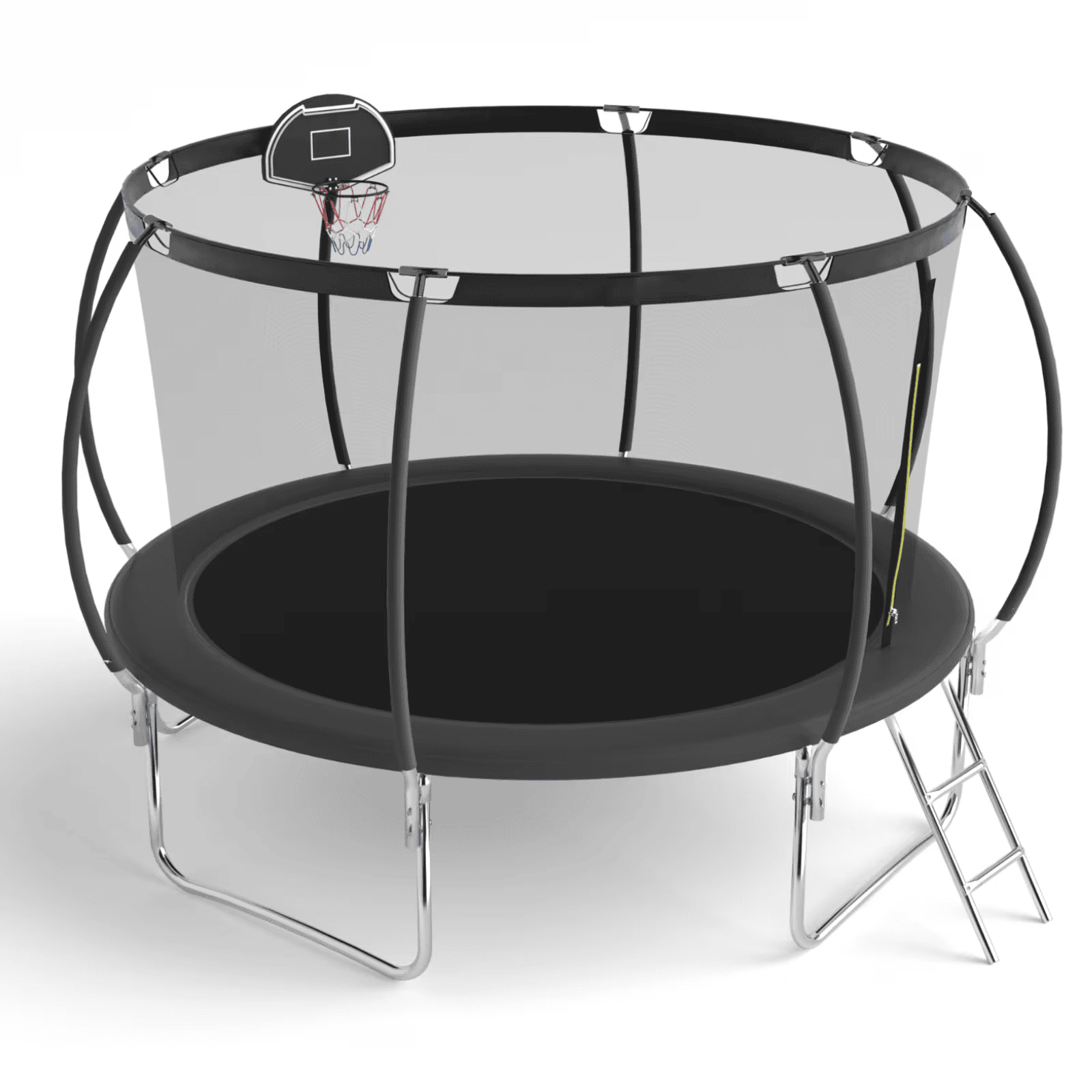12 FT TRAMPOLINE BLACK PUMPKIN-STYLE SAFETY NET WITH BASKETBALL HOOP