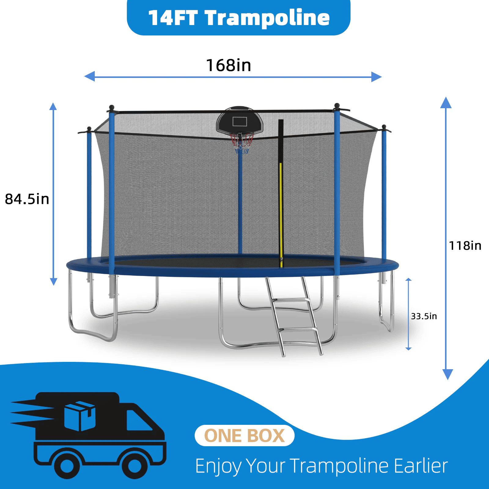 14FT TRAMPOLINE -- Jump mat is made of UV-protected polypropylene, woven to prevent slipping. Extra thick vinyl-coated spring pad is fade resistant. The mat is weathaerproofed and so the trampoline can be left outdoors. The safety pads are here to prevent any injury due to touching the springs and impacting hard areas.